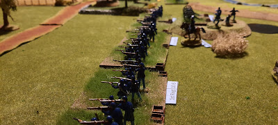 She made good use of the fence line, and movement cards, forming a decent defensive position, which the Confederate tide would get smashed upon.